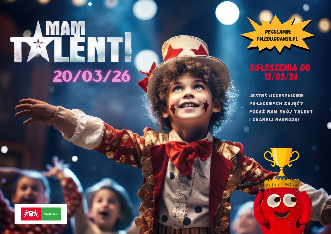 Z wielką radością zapraszamy uczestników zajęć Pałacu Młodzieży w Gdańsku do udziału w kolejnej edycji wyjątkowego konkursu „MAM TALENT”! 🎤✨ To doskonała okazja, aby zaprezentować swoje pasje, umiejętności i artystyczne talenty na prawdziwej scenie oraz podzielić się nimi z publicznością.