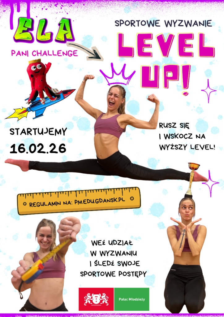 Level Up to sportowe wyzwanie skierowane do uczestników zajęć sportowych i tanecznych Pałacu Młodzieży w Gdańsku, którego celem jest zachęcenie dzieci i młodzieży do regularnej, samodzielnej pracy w domu oraz budowania nawyku systematyczności i samodyscypliny.